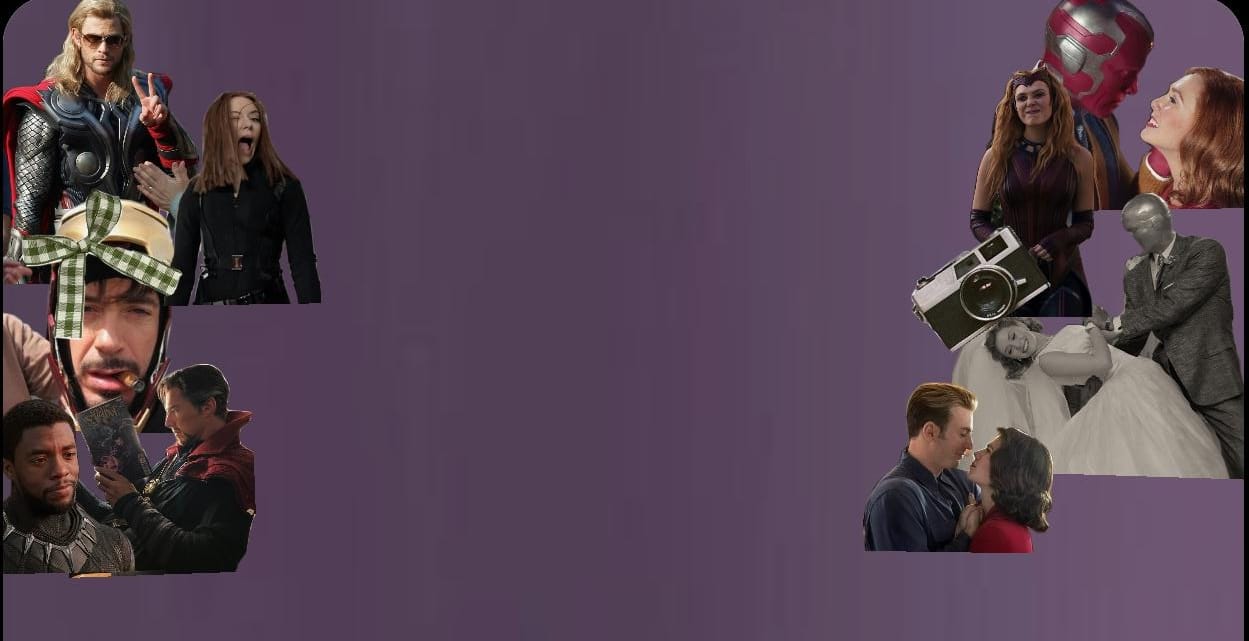 Empecé a ver las peliculas de marvel por mis hermanas mayores, nos gusta ver mucho Iro Man, por los soundracks muy buenos que tienen y porque Tony es un crack 😼. Mi primer personaje favorito fue iro man, porque siempre jugaba con una figura de colección muy bonitaa. Sinceramente me gustan mas las peliculas donde estaban todos los vengadores, después de la pelicula "endgame" ya no fue lo mismo, aunque la serie "Wandavision" uff fue hermosa, fue una de las mejores series que Marvel pudo haber hecho, el trama esta buenísimo✨ . Wanda es mi personaje favorita, desde que apareció en "la era de ultron" junto a su hermano Pietro, tan fan que cuando cumplí 11 años mi temática fue de Wanda JSKJAJS 😹.
